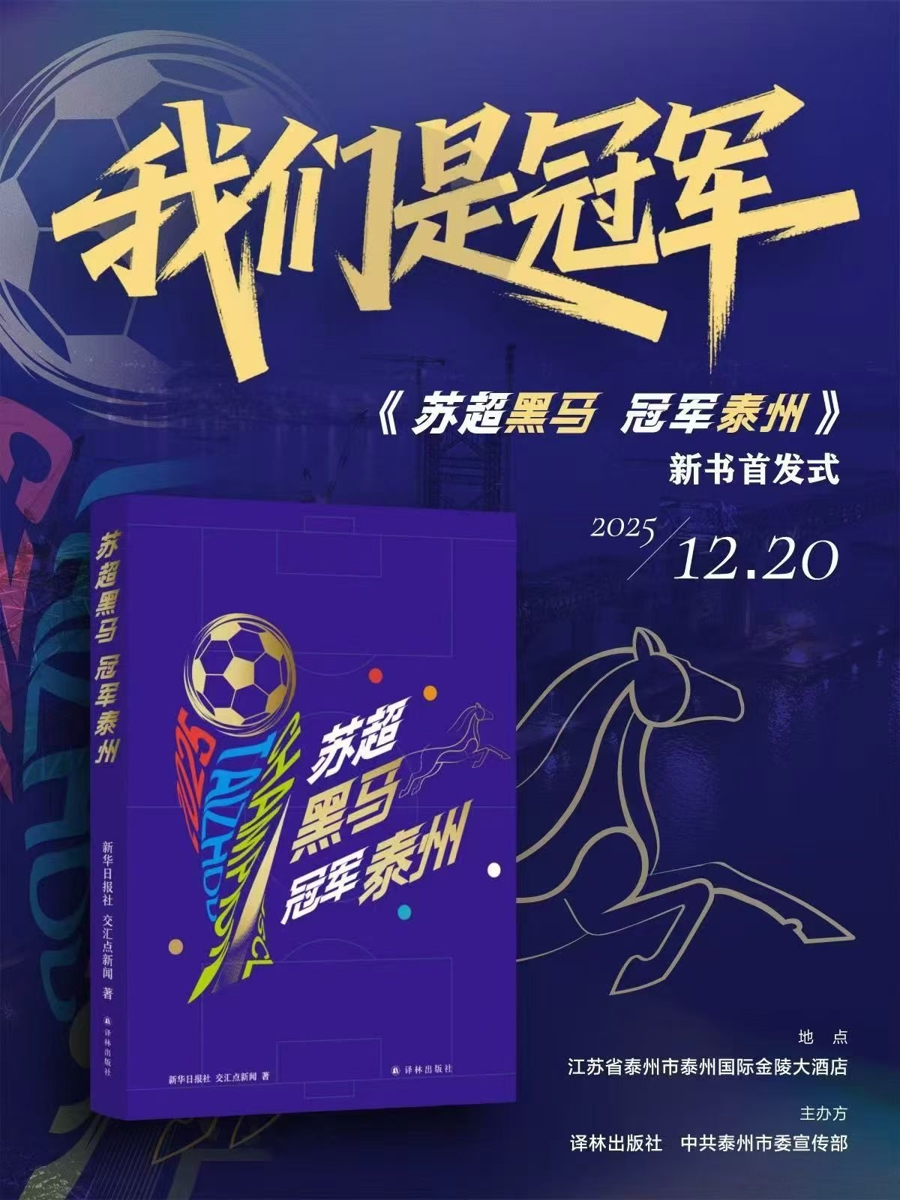 从今年5月到11月,176个日夜的热血与感动,凝结成了全新纪实佳作:《苏超黑马 冠军泰州》。本书既是赛事纪实,更是城市史诗,珍藏着全民共赴的一次伟大征程。12月20日,“我们是冠军——《苏超黑马 冠军泰州》新书首发式”在泰州举行。该书由译林出版社于2025年12月正式推出。