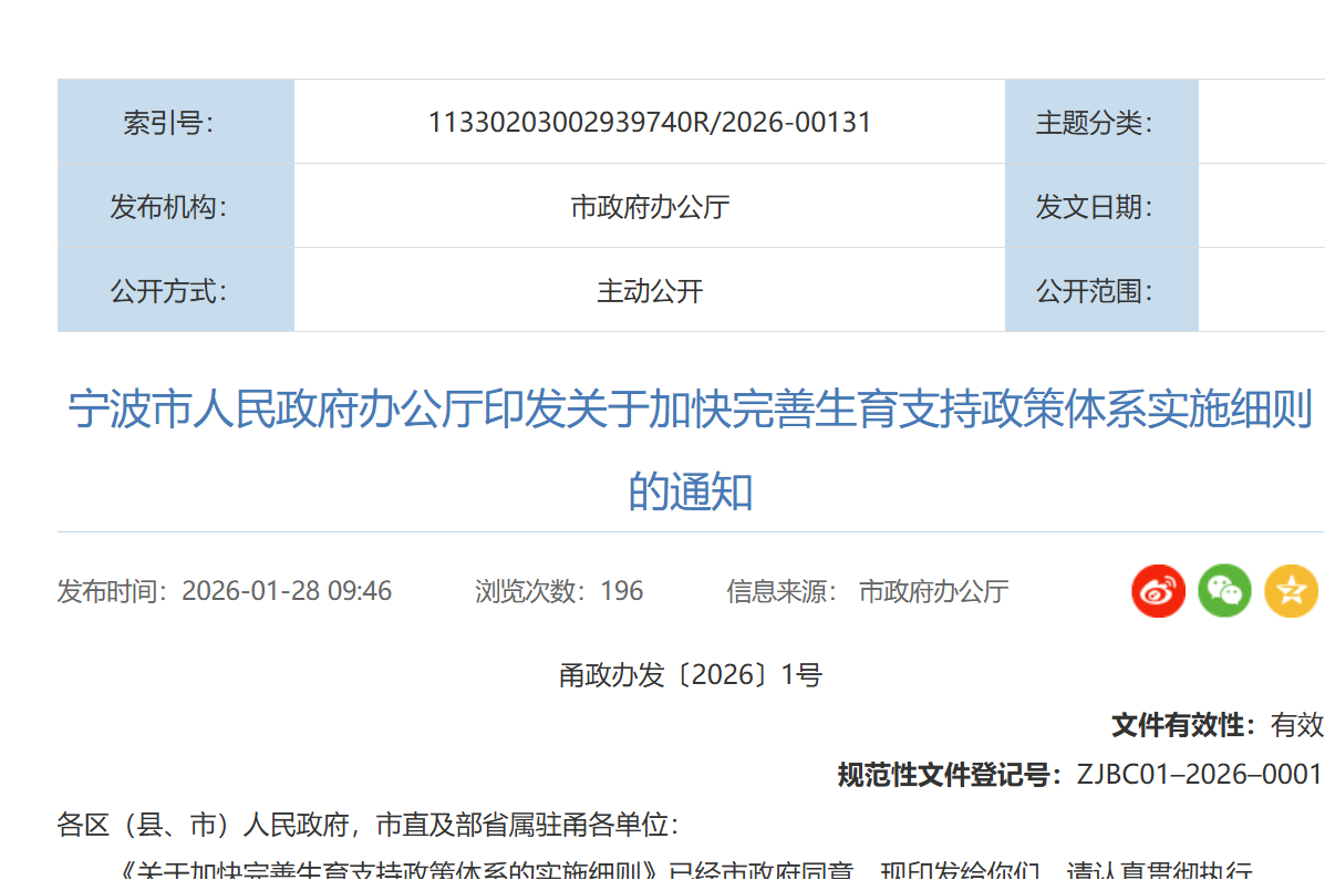 1月28日,宁波市印发《关于加快完善生育支持政策体系的实施细则》,结合本地实际,在生育支持相关领域明确多项保险配套举措,助力建设生育友好型社会,落实省级生育支持政策要求。